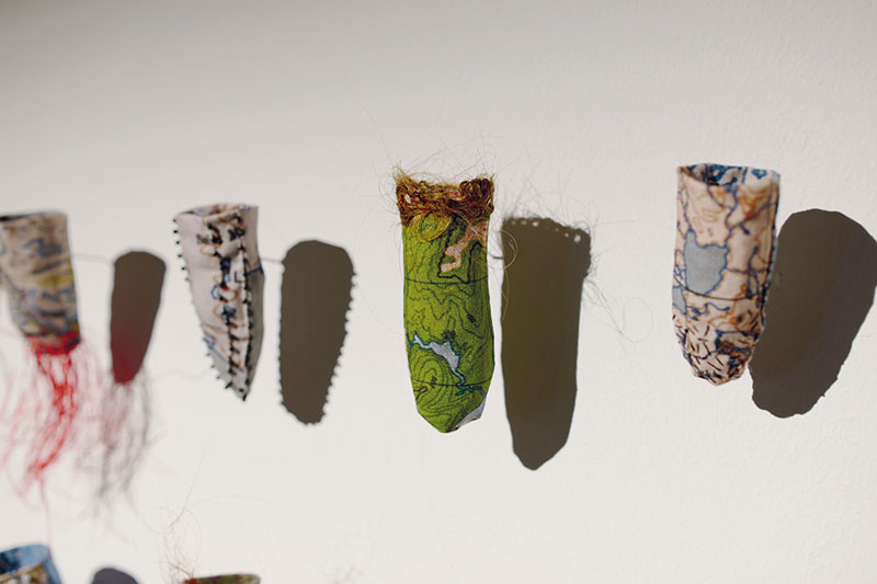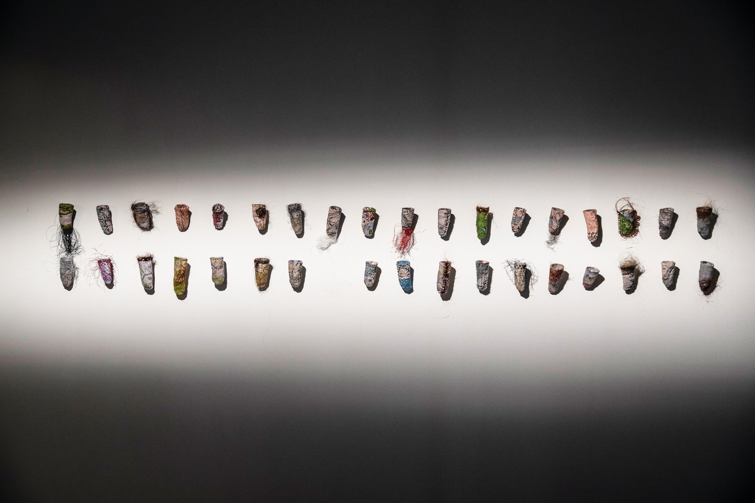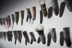 Bomullstyg, människohår, nylontråd, glaspärla, stålstift, 2021