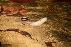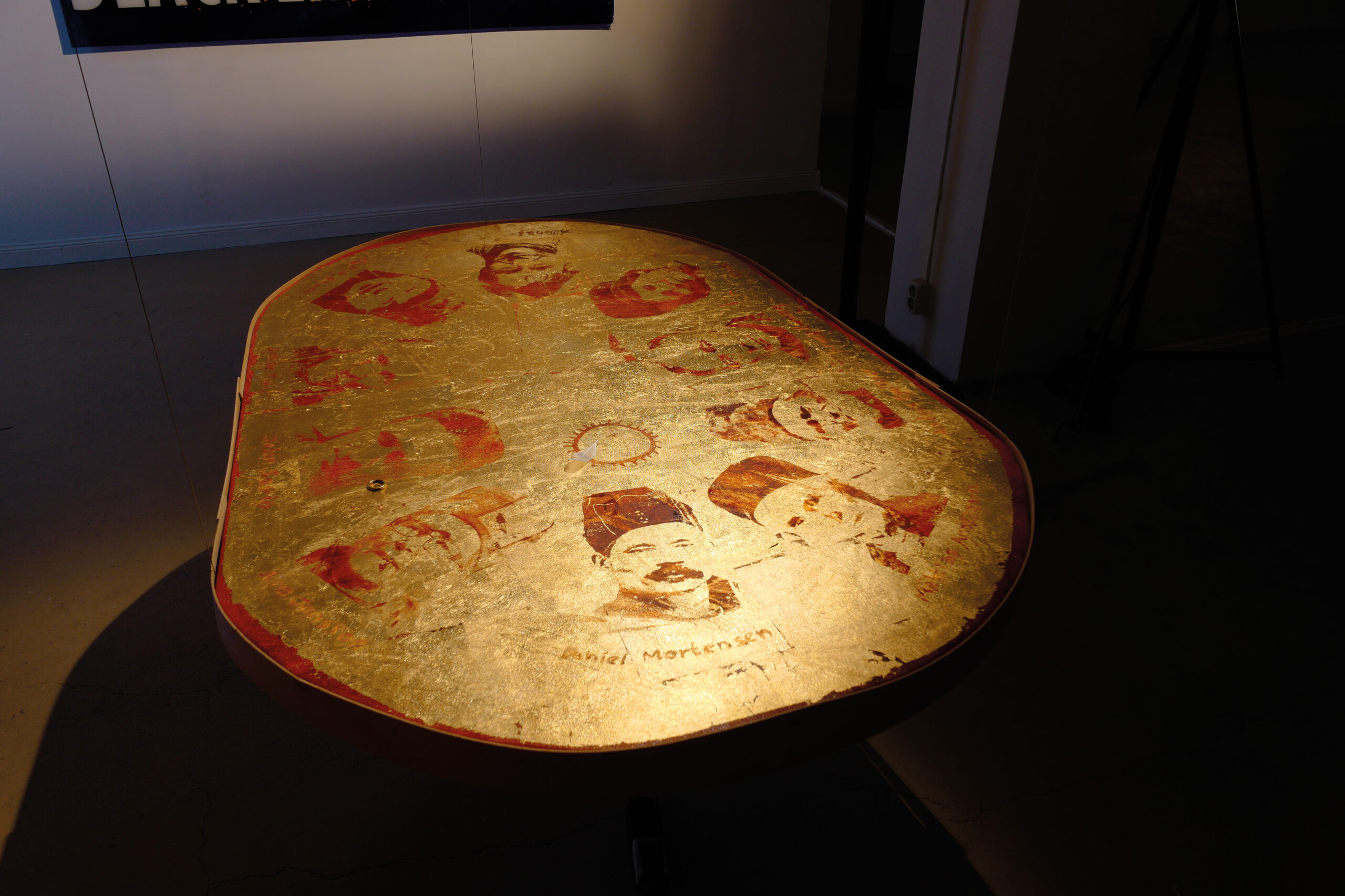 Saemietrumma, serigrafi och olja på duk, bladguld, trä, elmotor, mässingsring