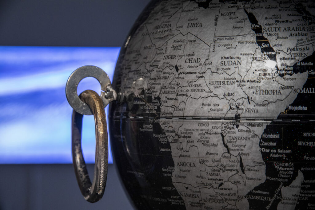 Skulptur av en jordglob och en fjäder från en sparkcykel